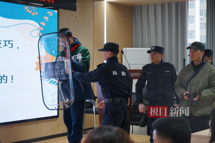 随后,李帆邀请一名男生上台体验。“双手持盾,注意保持距离!”在队员们的指导下,学生弓步顶盾,将“持刀歹徒”的攻势成功化解。台下顿时爆发出雷鸣般的掌声与欢呼。